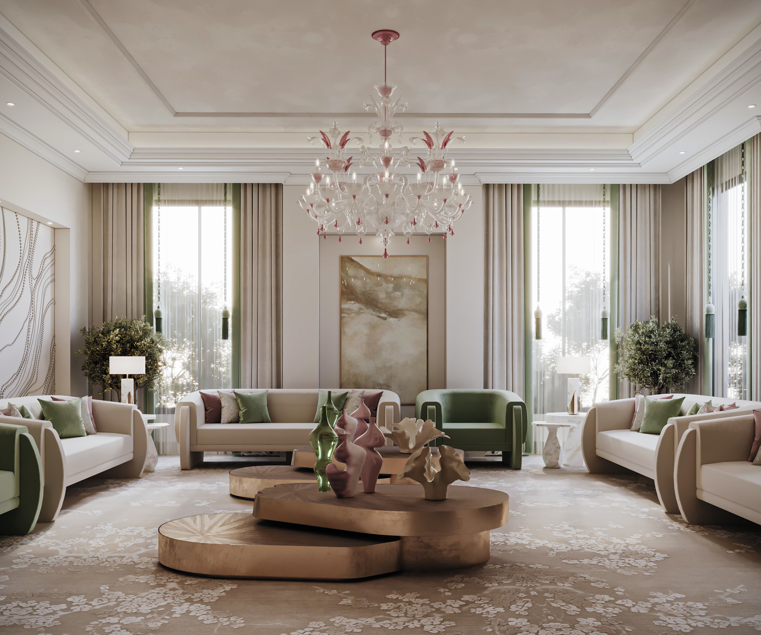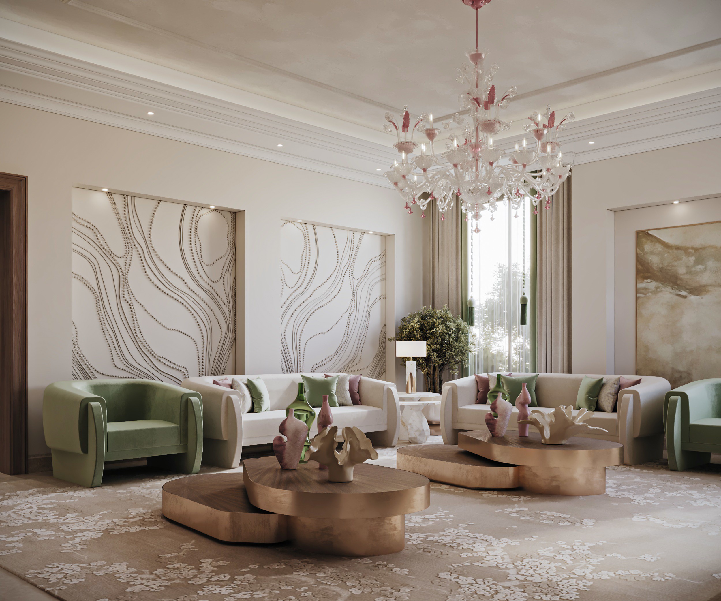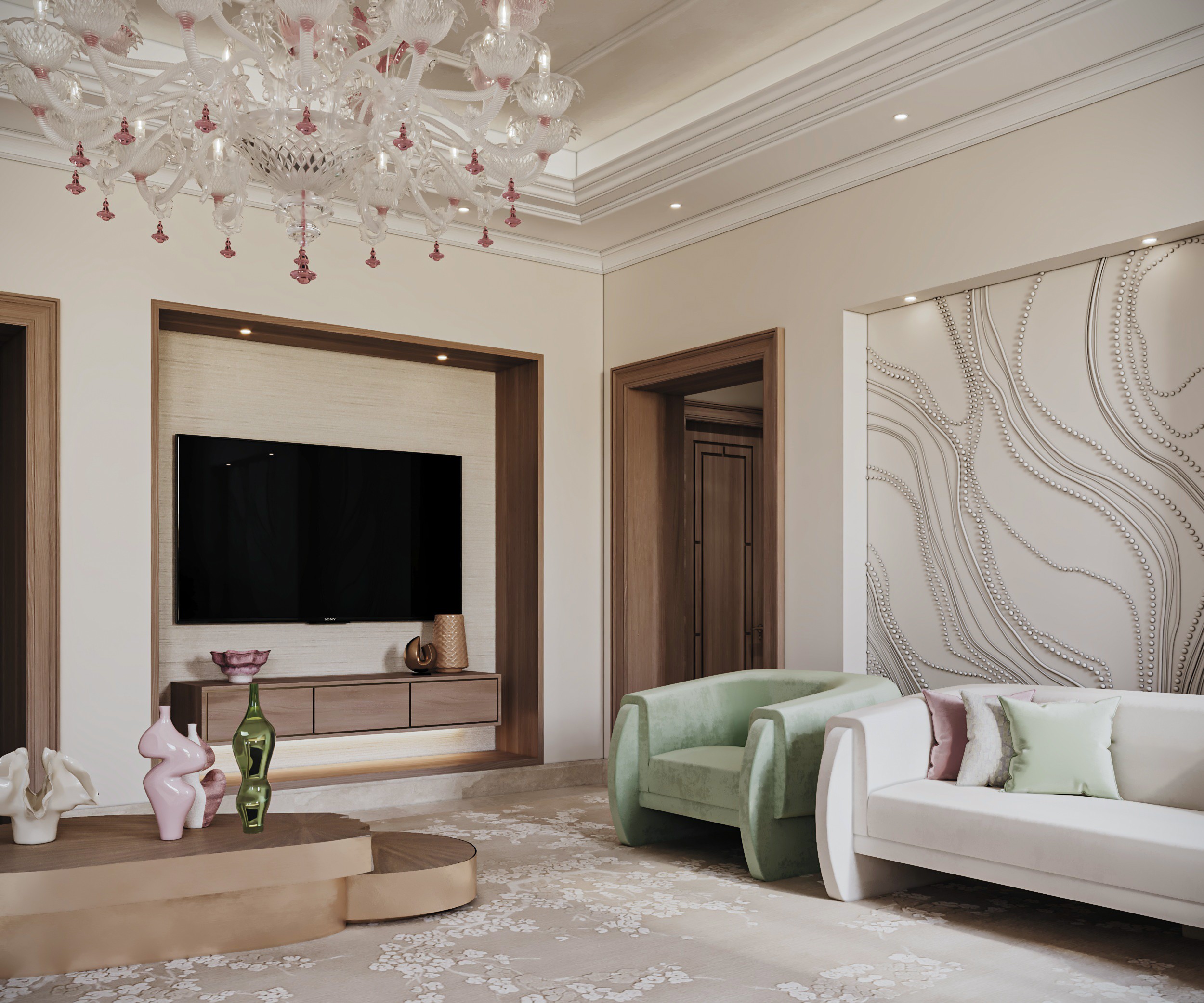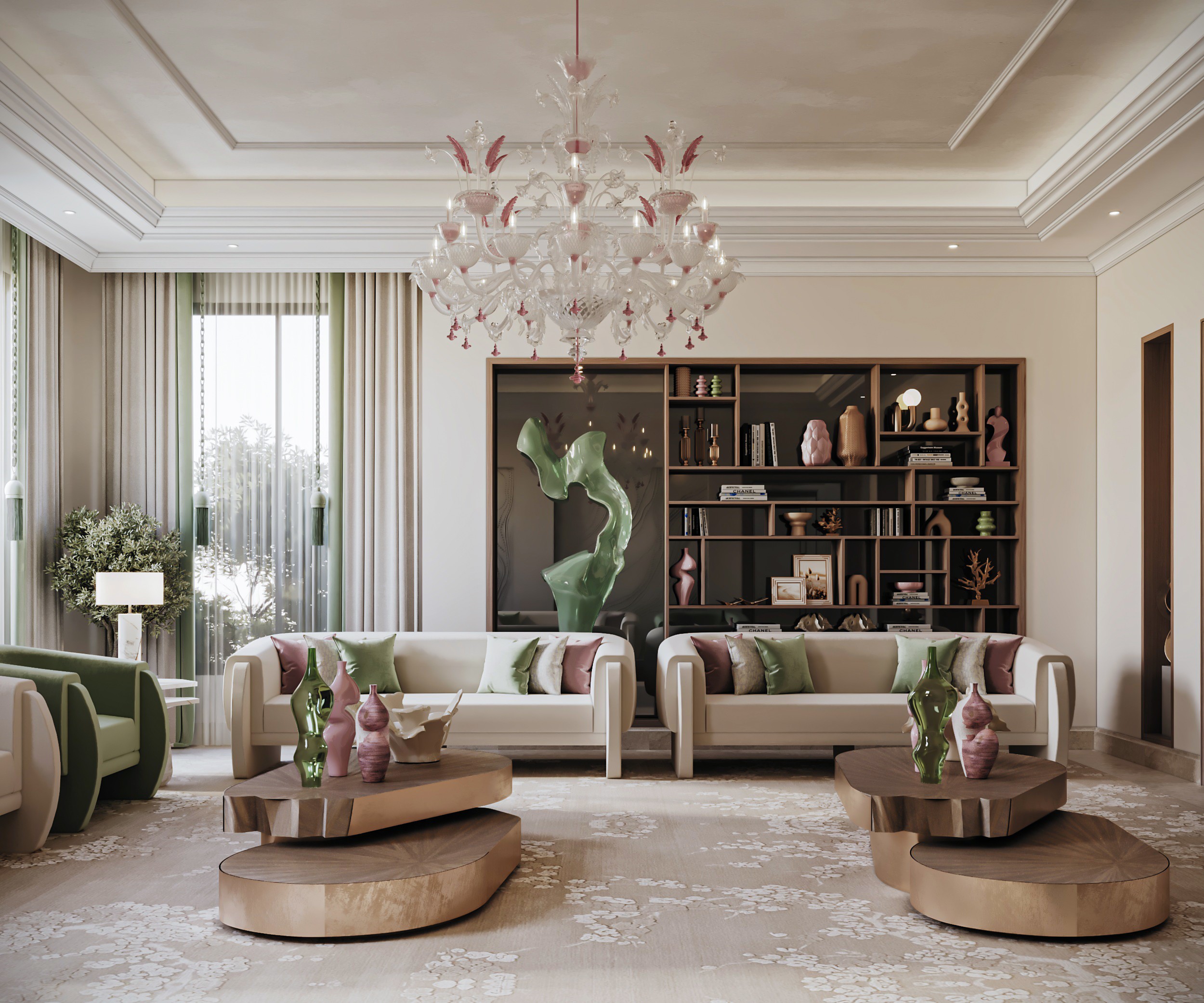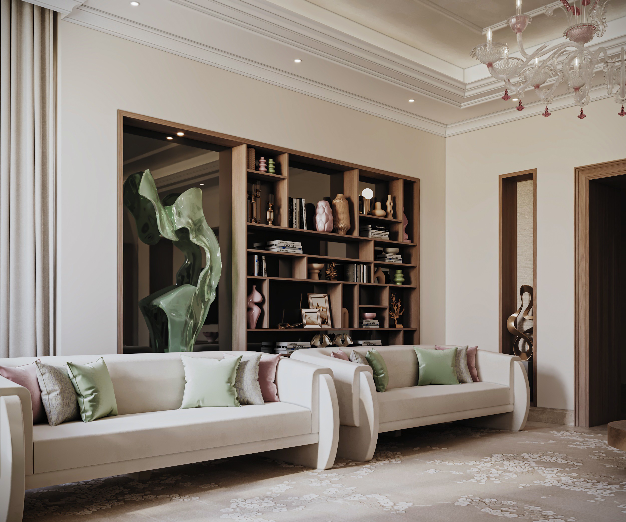 Soft, neutral hues set the tone at Gracewell Residence, accented by subtle jade greens and warm bronze details. A sculptural coffee table anchors the reception, while a custom wooden bookshelf adds depth and character. A balance of warmth and elegance.