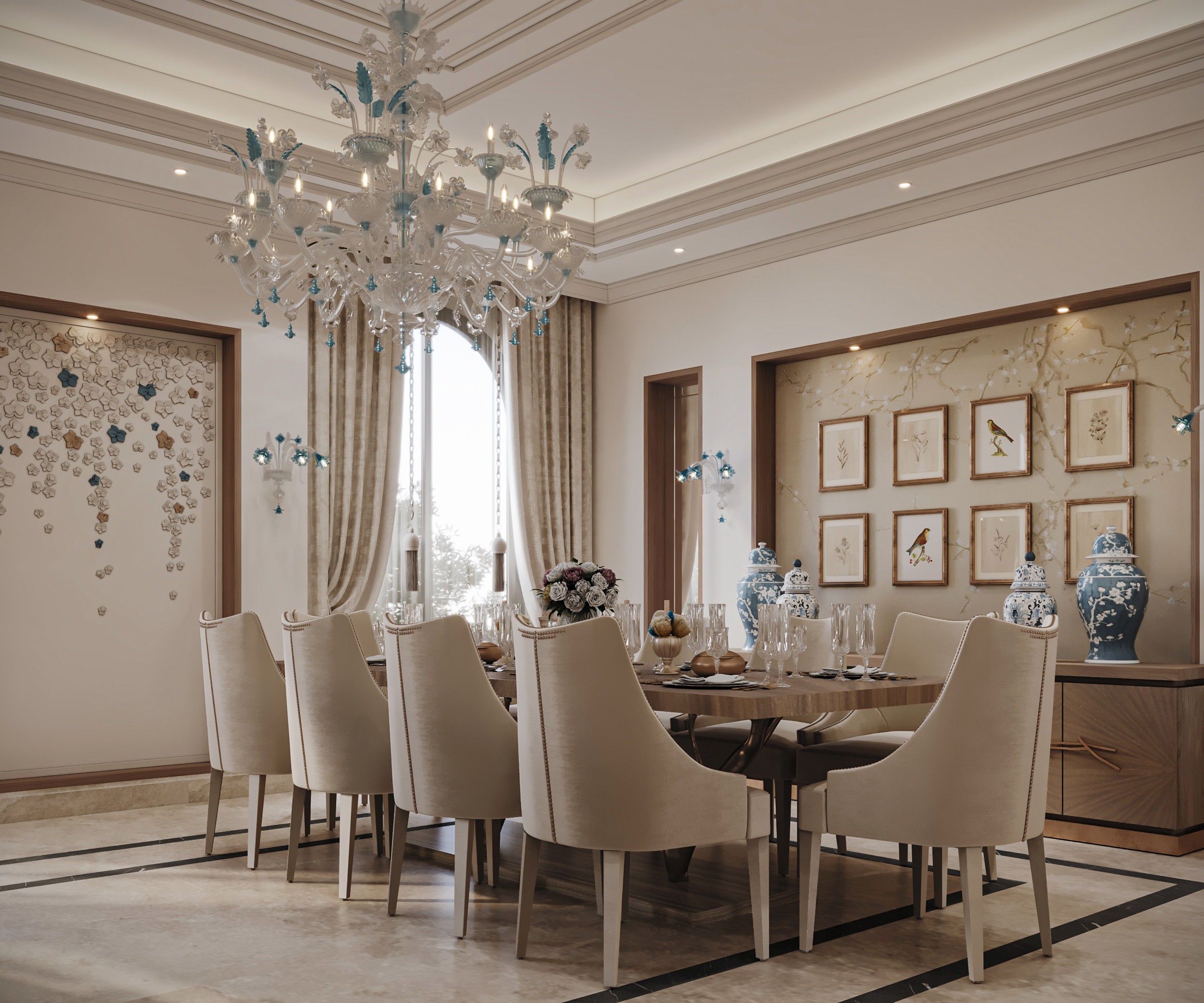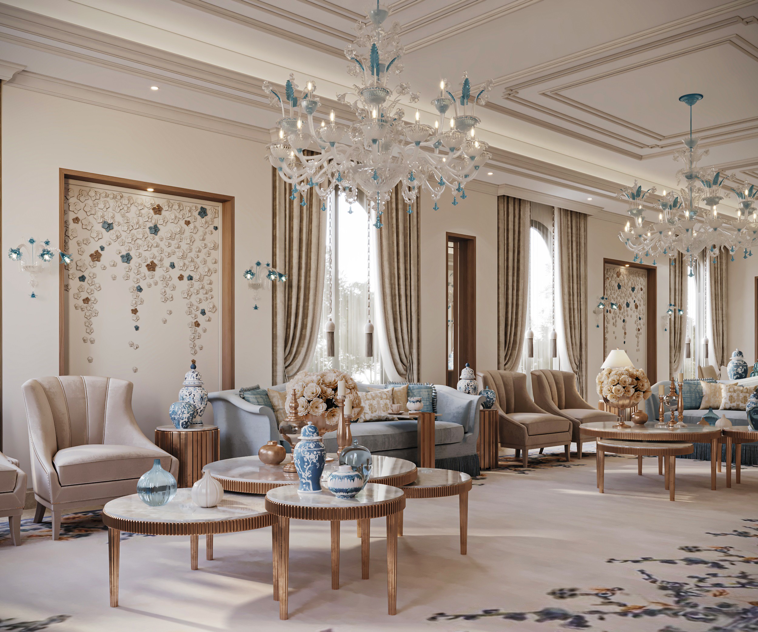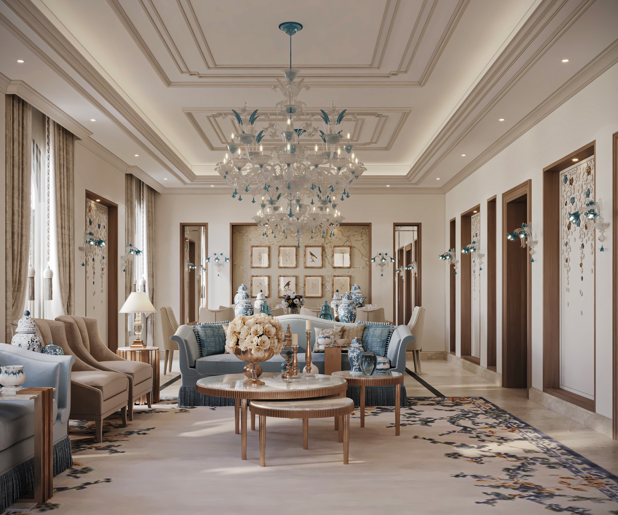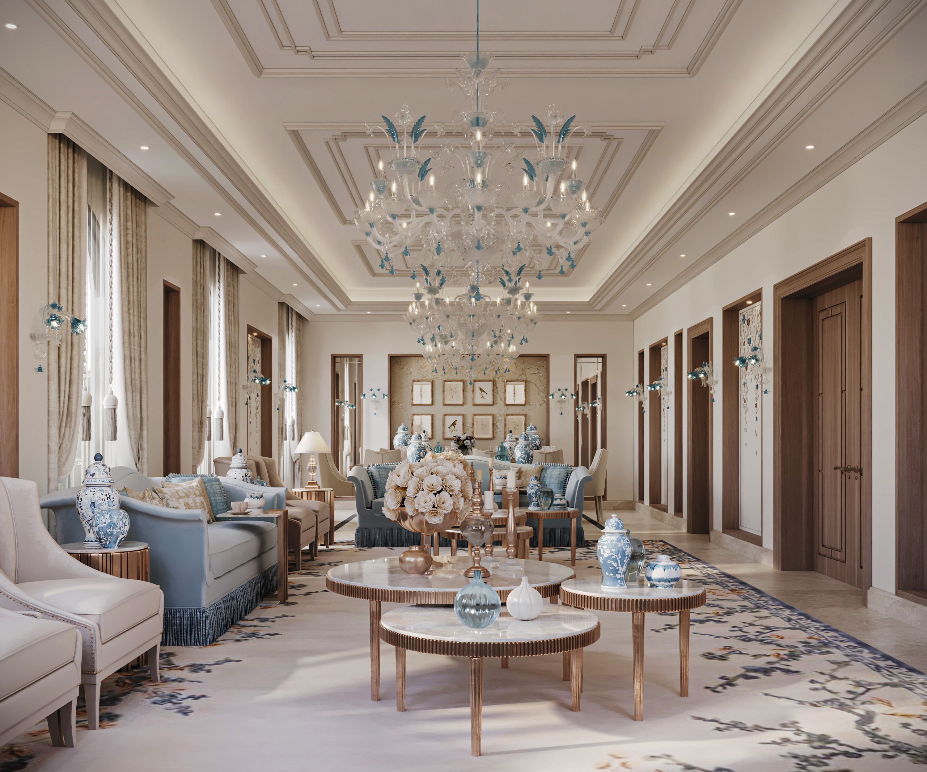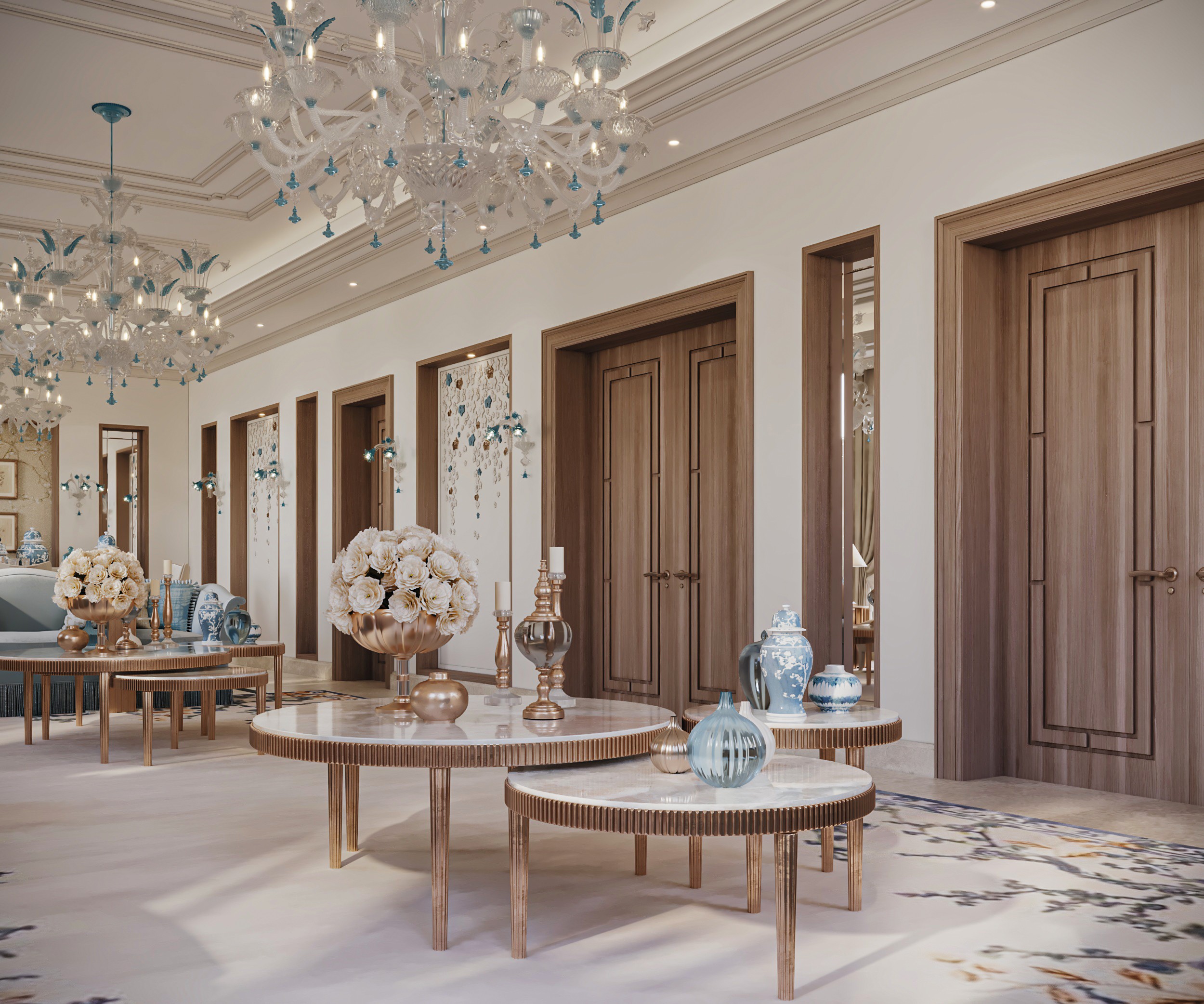 Soft, neutral hues set the tone at Gracewell Residence, accented by subtle jade greens and warm bronze details. A sculptural coffee table anchors the reception, while a custom wooden bookshelf adds depth and character. A balance of warmth and elegance.
