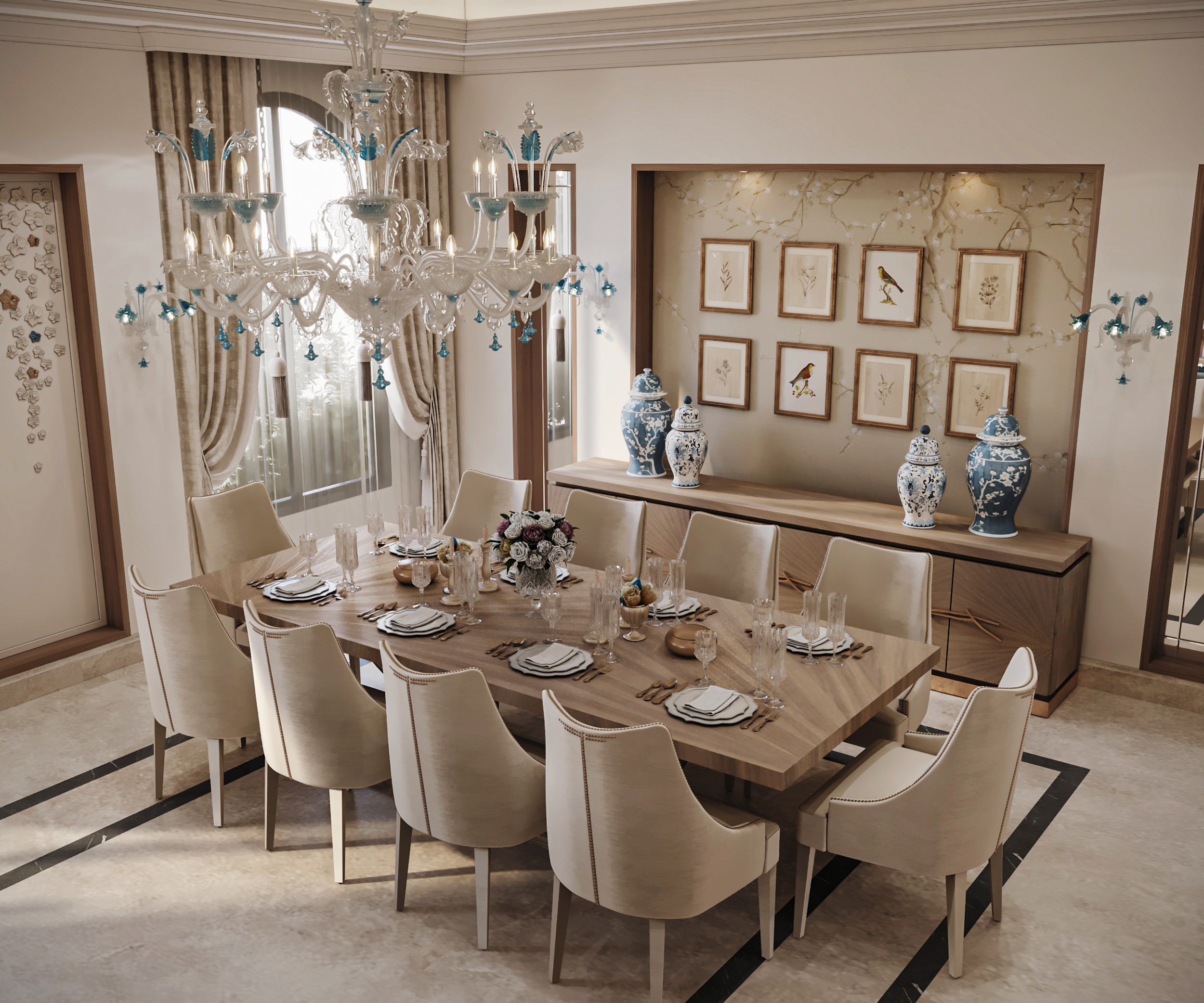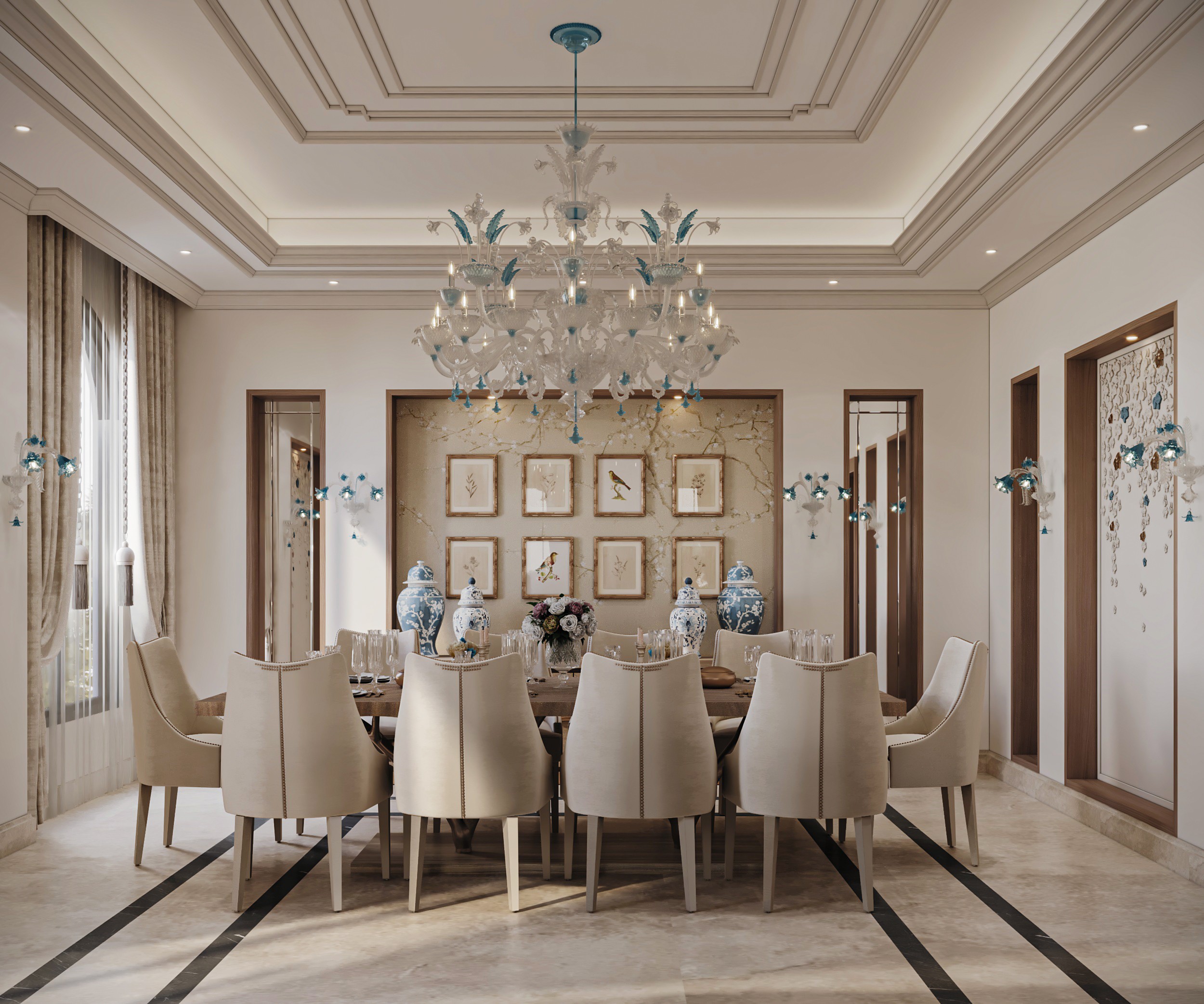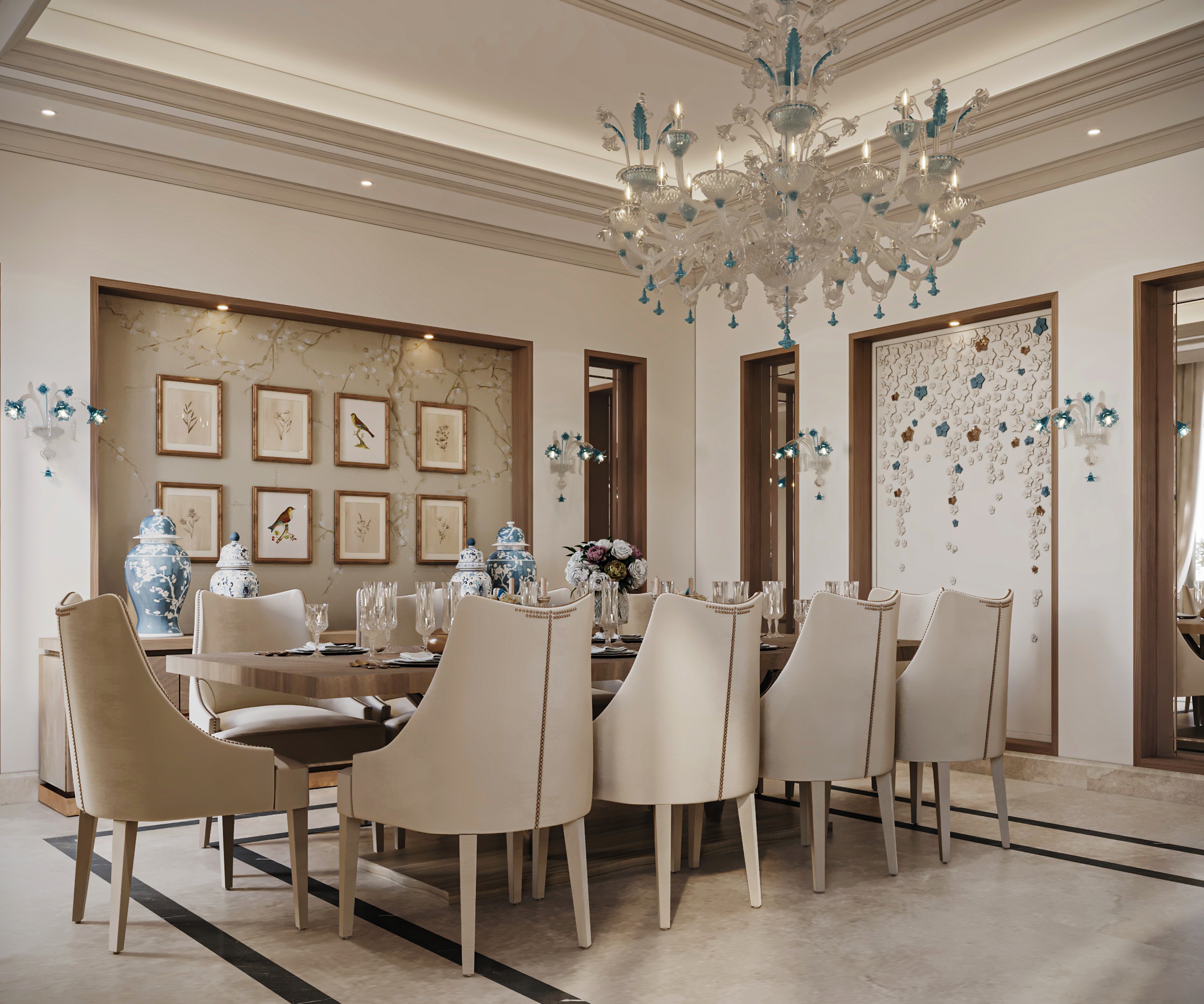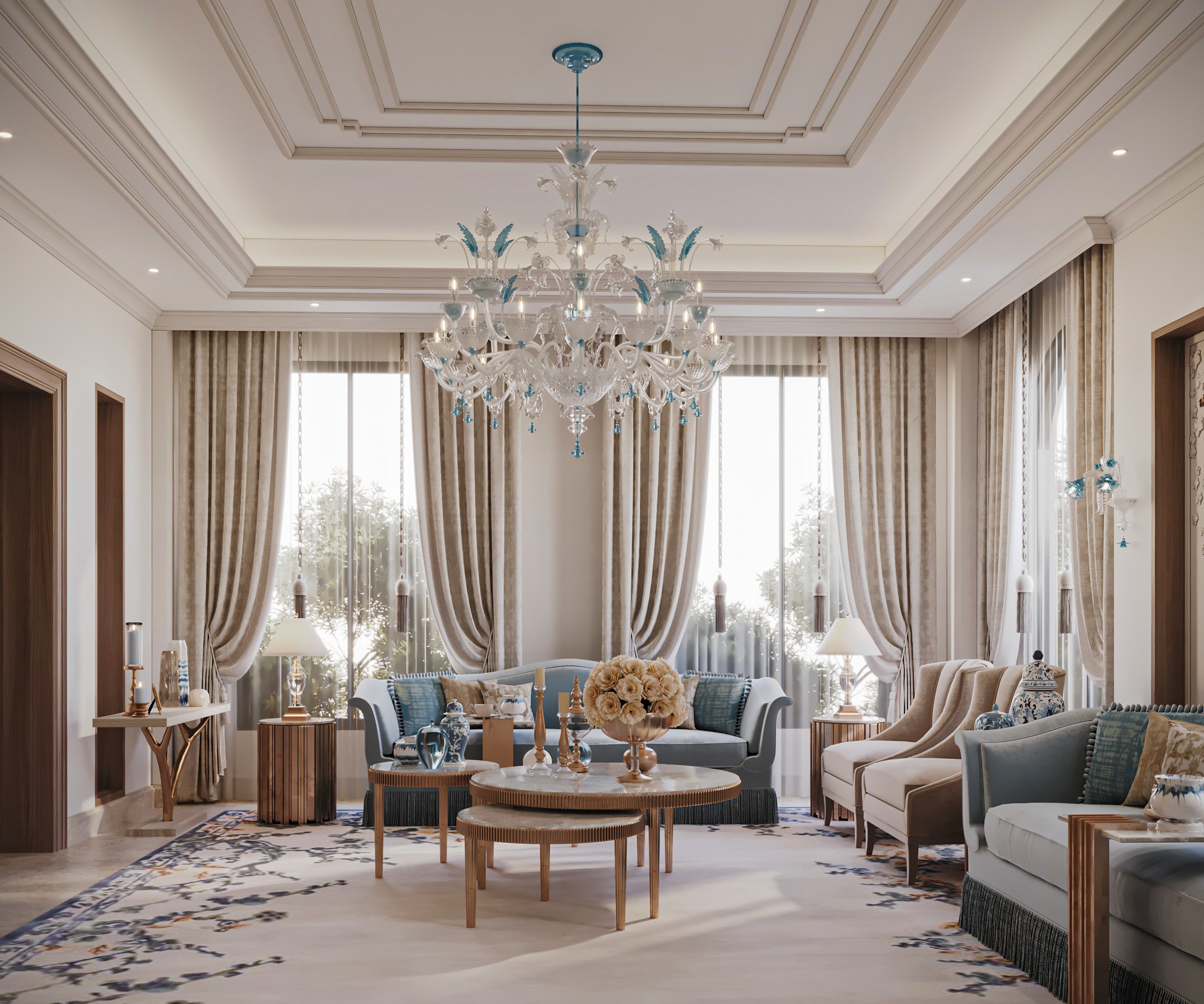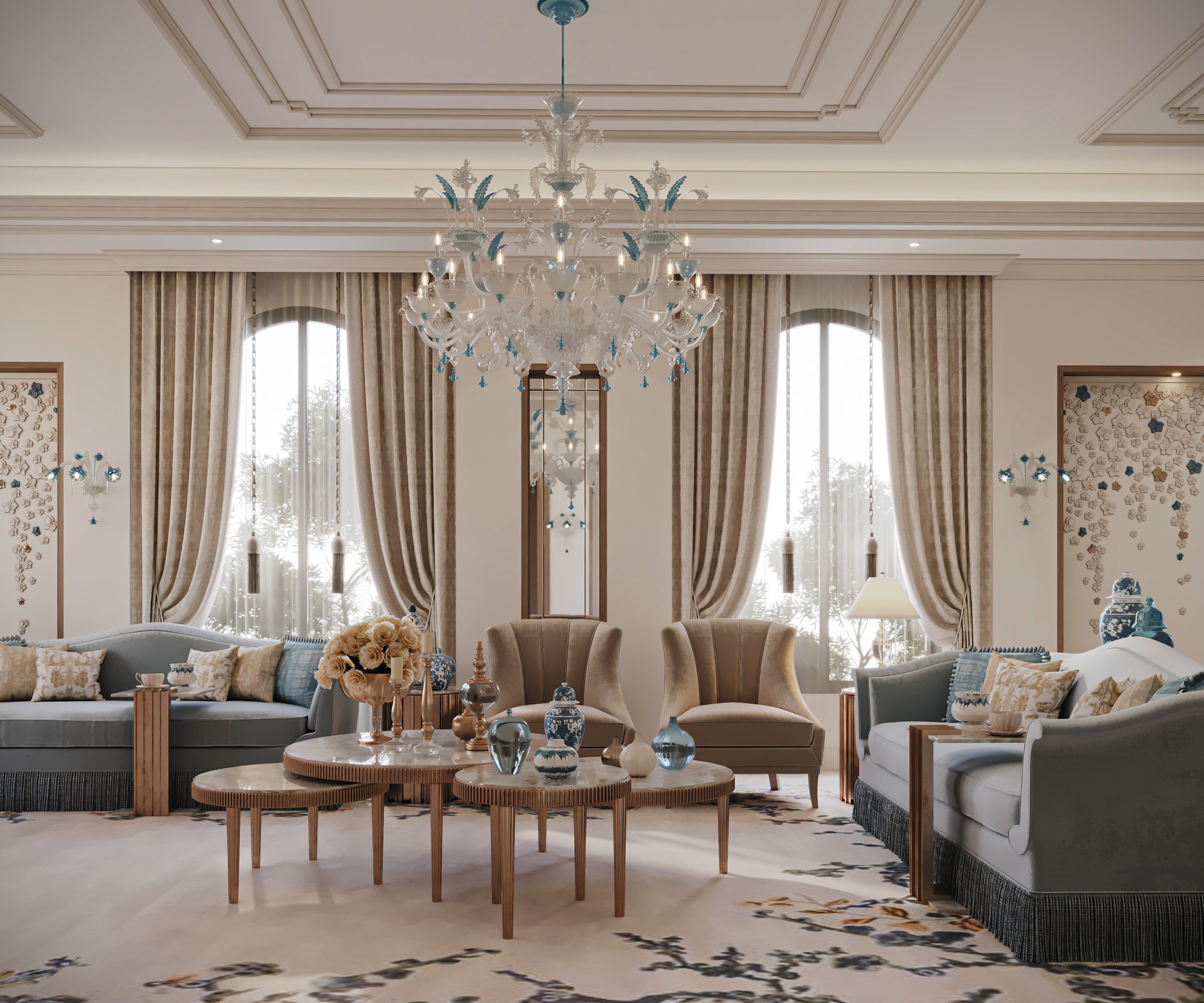 Soft, neutral hues set the tone at Gracewell Residence, accented by subtle jade greens and warm bronze details. A sculptural coffee table anchors the reception, while a custom wooden bookshelf adds depth and character. A balance of warmth and elegance.