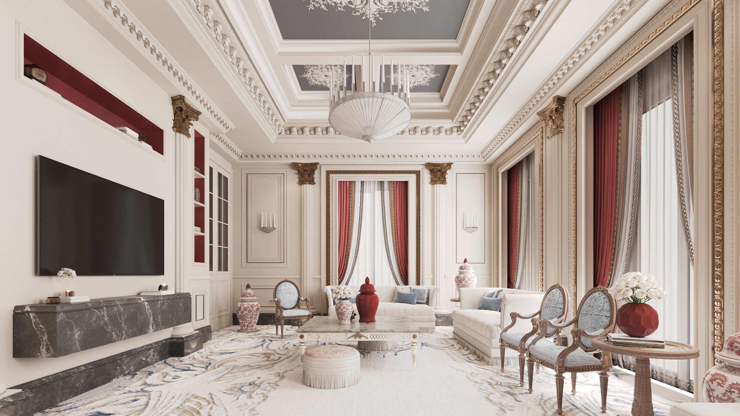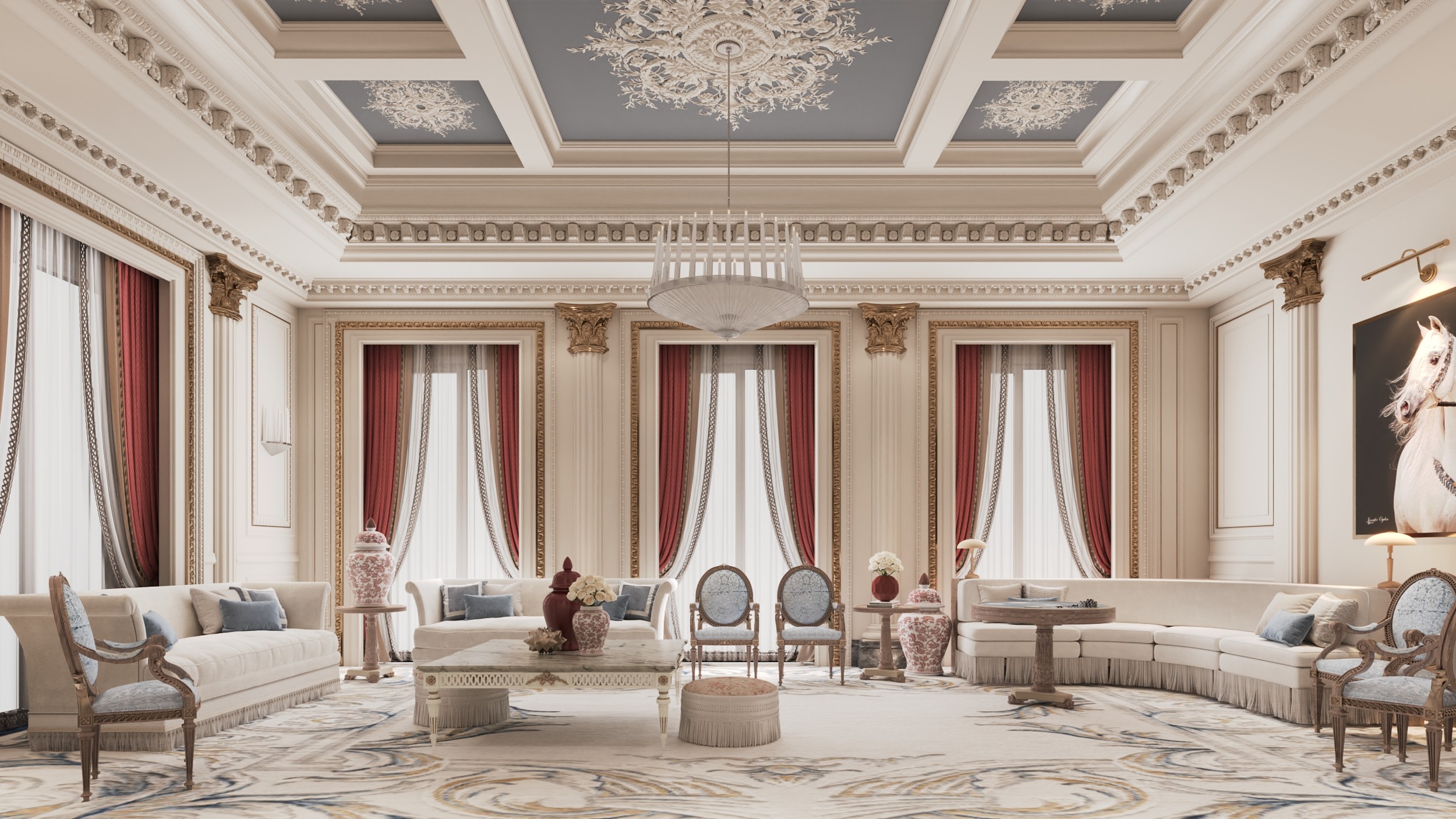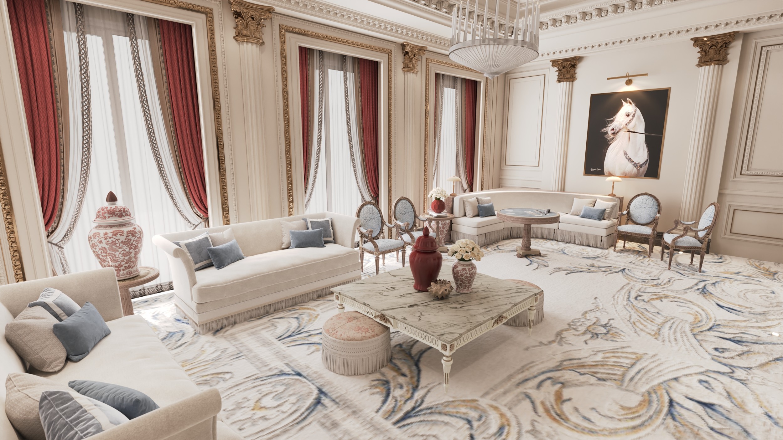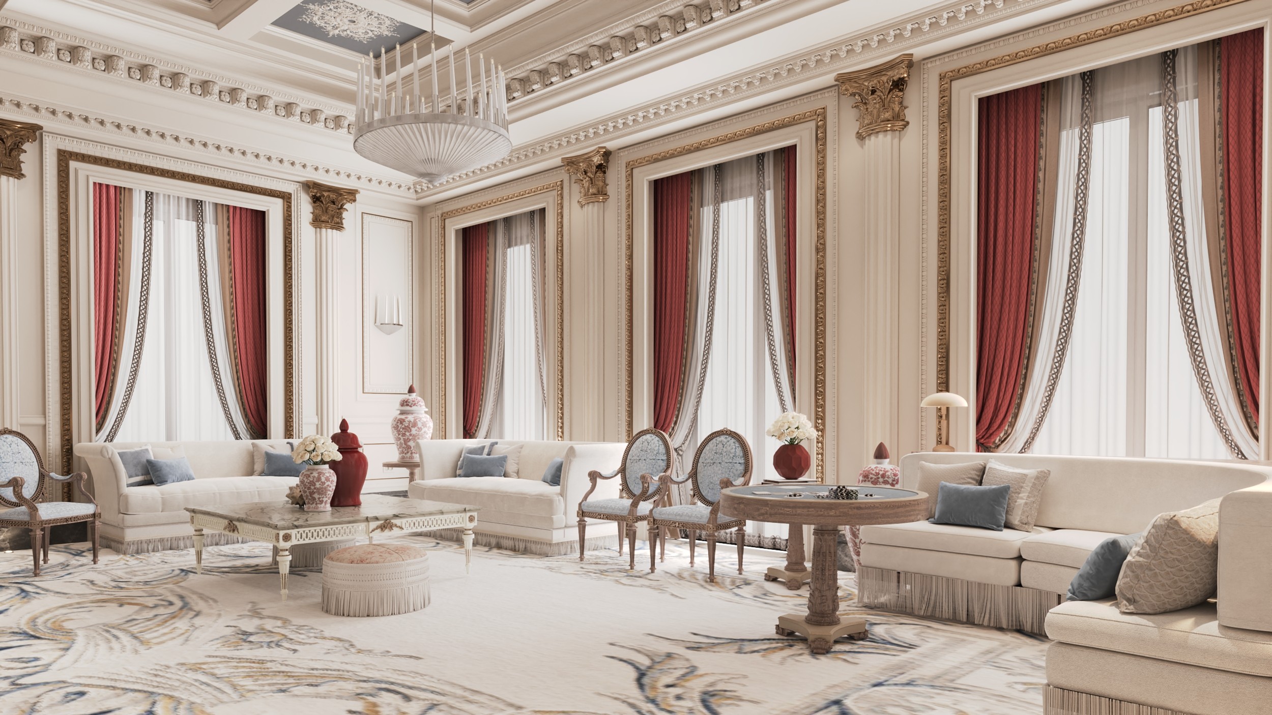In The Opaline House, classic elegance meets a restrained modern palette. Cream tones are elevated by soft burgundy reds and gentle grays across the majlis, dining room, and lobby. Creating a quietly luxurious atmosphere that bridges tradition and contemporary style with ease.